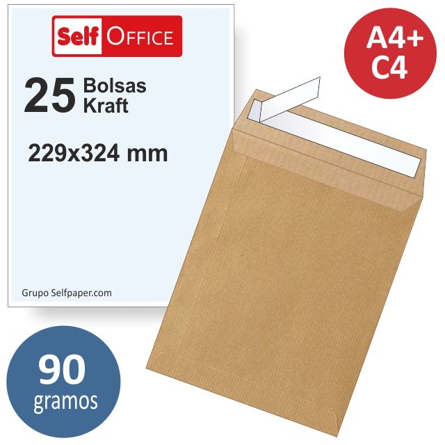 Bolsas de papel kraft marrón. Paquete de 25 sobres 229x324 mm Din A4+, C4, para envÃo de documentos tamaño A4, folio. Fabricadas con resistente papel kraft color marrón, de 90 gramos de grosor. Autoadhesivas, con cierre adhesivo de silicona. Formato 324x229 mm. Económicas.