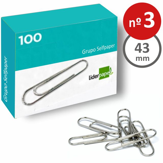 Caja de 100 clips galvanizados de 43 mm. Número 3, nº 3. Labiados. Fabricados con alambre de acero galvanizado. Calidad Extra. Este clip ofrece una alta resistencia y durabilidad. Y buen agarre, al ser labiado. Marca Liderpapel.
