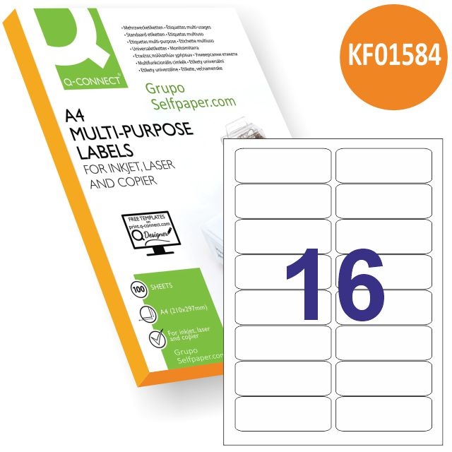 Caja con 100 hojas A4 con 16 etiquetas autoadhesivas de 99,1 x 33,9 mm en cada hoja. Total 1600 pegatinas. Marca Q-Connect, modelo KF01584. Para imprimir en impresoras lás o ink.jet. Papel blanco mate de 70 gramos/m2 con certificado FSC. Económicas. Similar Apli 02418, Multi3 04727.