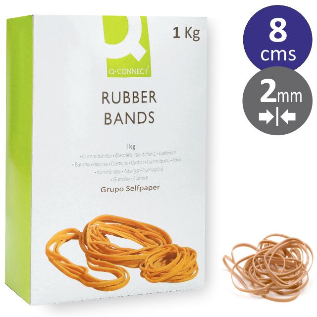 Gomas elasticas en bolsa o caja de 1 Kilo. Alta calidad, 70% de caucho natural. Resistentes y elásticas. Para la oficina e industria. 2 mm de grosor. Gomillas o elasticos de 1 kilogramo. 8 cms de longitud. 8 centimetros. Corresp, Apli 12864, Q-Connect KF14685, 54324. Disponibles en cajas de 100 gramos.