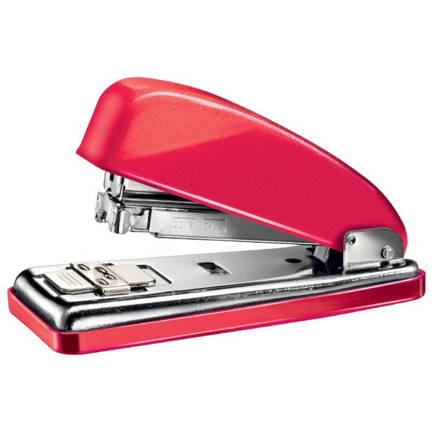 La grapadora de siempre con tono moderno y actual. Grapadora Petrus Wow en color rojo metalizado. Grapa hasta 30 hojas a la vez.