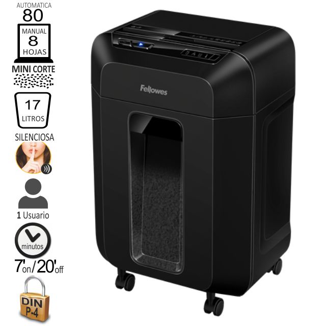 Destructora de papel automática Fellowes Automax 80M. Destruye hasta 80 hojas automáticamente. 8 hojas a la vez, manualmente. PartÃculas de 8x12 mm, Minicorte. Nivel de seguridad P-4. Para 1 usuario. Papelera de 17 litros. Ciclo de 7 minutos destruyendo, enfriando.