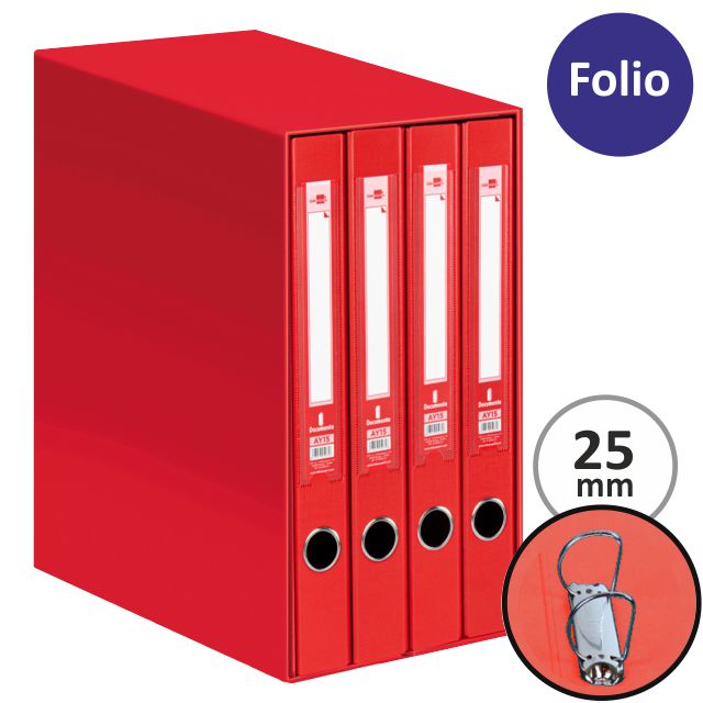 Módulo con 4 carpetas de 2 anillas de 25 mm, mixtas. Color rojo. Formato folio. 189 mm de ancho, alto: 350 mm y fondo: 290 mm.