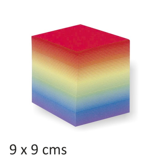 Taco Notas de colores Arco Iris tamaño 9x9 cms. 680 hojas. Papel de 90 gramos de grosor que no traspasa la tinta. Surtido