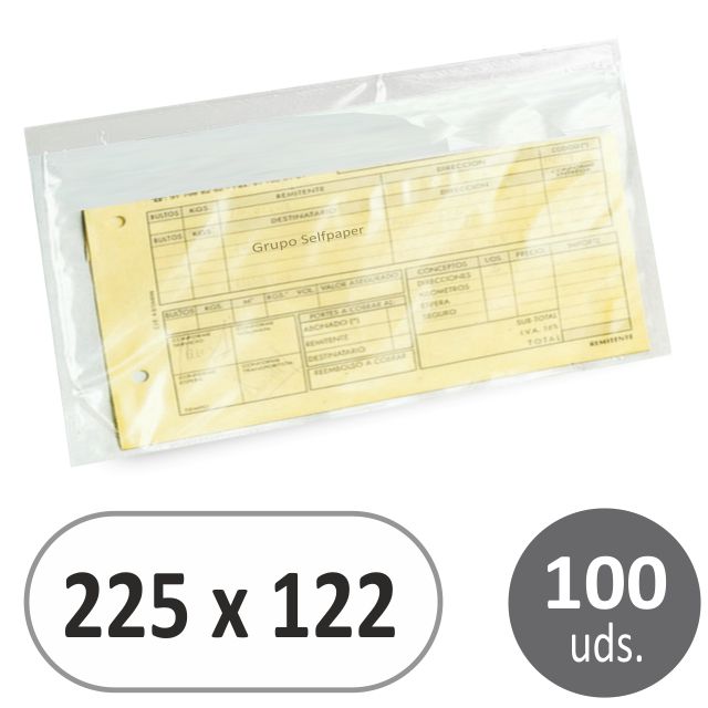 Pack 100 sobres autoadhesivos para envÃos, para pegar sobre las cajas o paquetes. Interior útil: 122x225 mm. Exterior: 130x235 mm Sobres de plástico transparente, sin textos, portadocumentos, dokufix, o packing list. Bolsas ideales para incluir los albaranes, facturas o listas de productos.