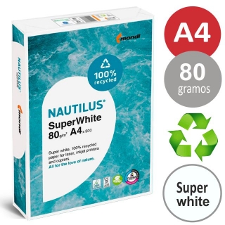 DisponibleTarifa : 0,15Ahorro hasta:40%desde: 0.09 €0,11 con Iva - más vendido de su clasePapel reciclado Nautilus SuperWhite ultra blanco A4 80 grsRef: 013408010001 [ 152730 ]