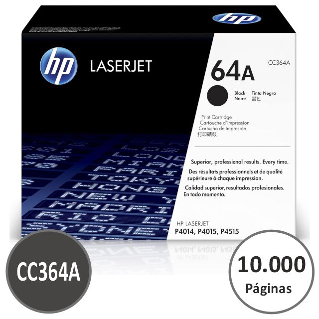 Tóner original HP 64A, CC364A . Para impresoras y equipos HP Laserjet P4014, P4015, P4515. P4014n, P4014dn, P4515x, P4515xm, P4015dn, P4015n, P4015tn P4015x, P4515n, P4515tn Hasta 10.000 páginas de impresión. según norma ISO/IEC